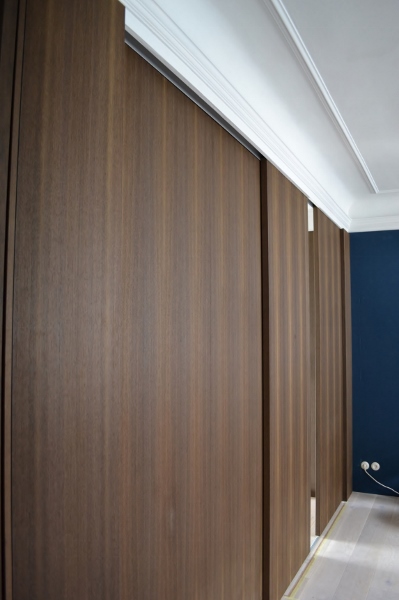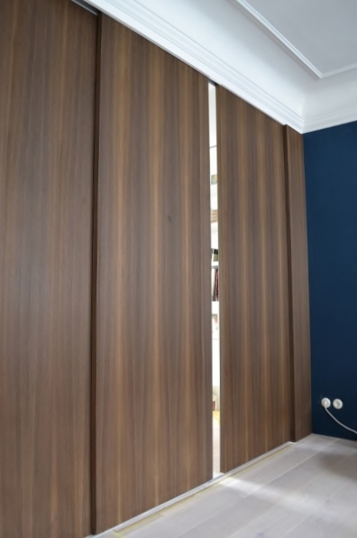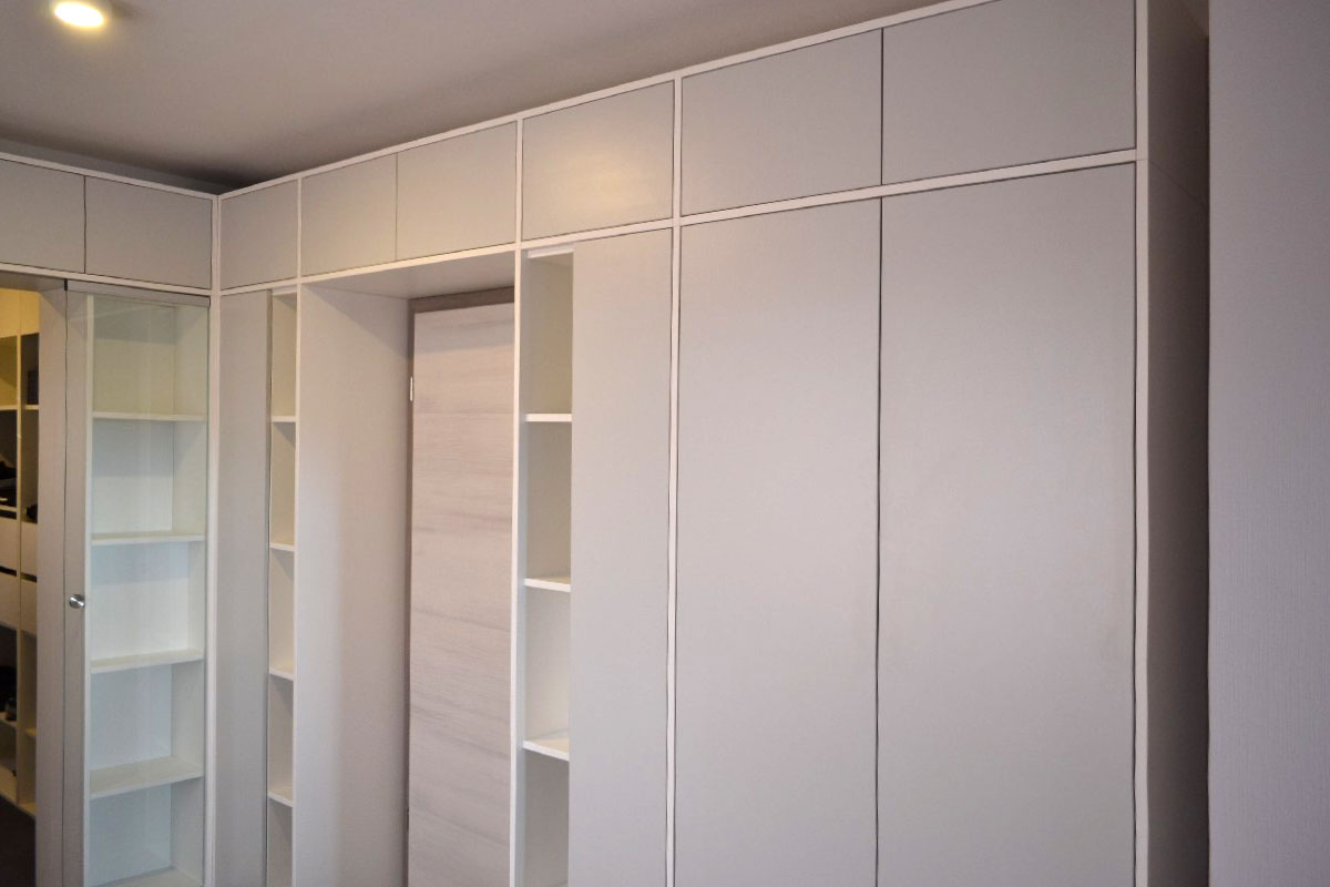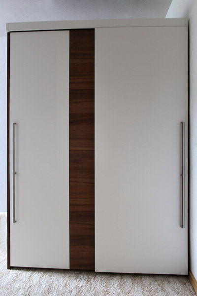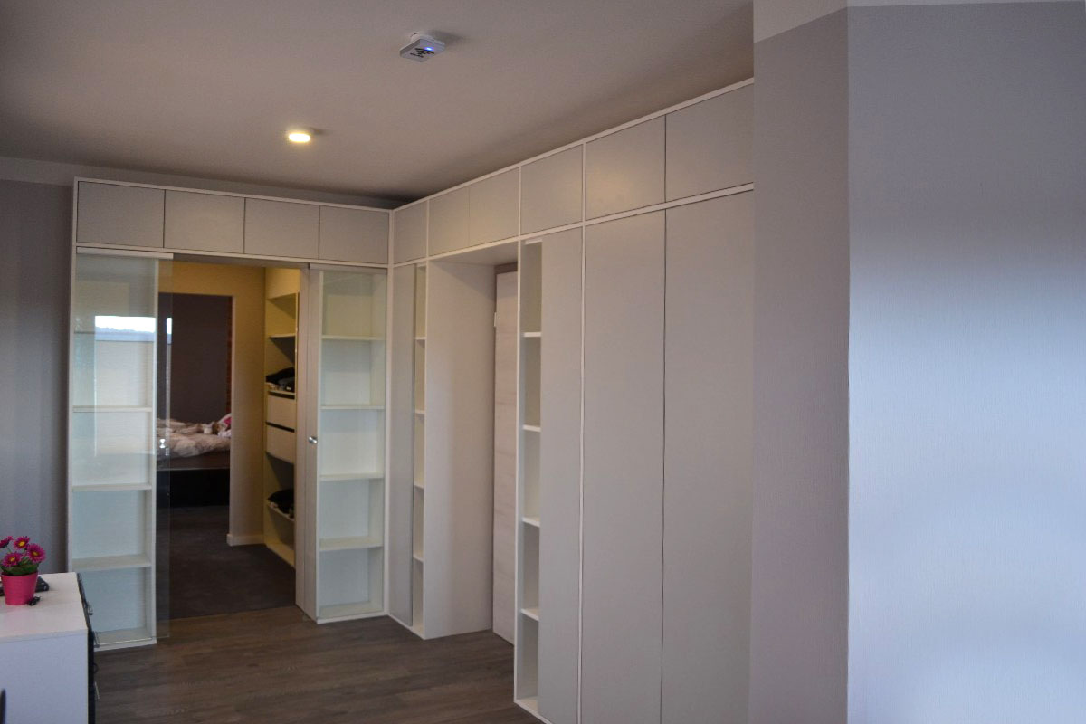 Einbauschrankelemente mit Durchgangsbereich und integrierter Glasschiebetür - Fronten Grifflos mit Tipmatic - helle Körper mit leicht abgesetzten Fronten
