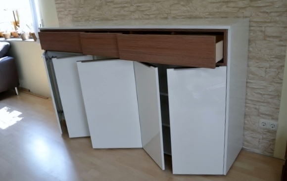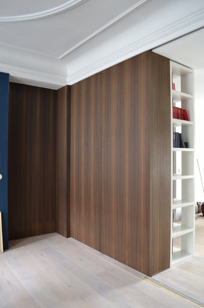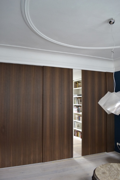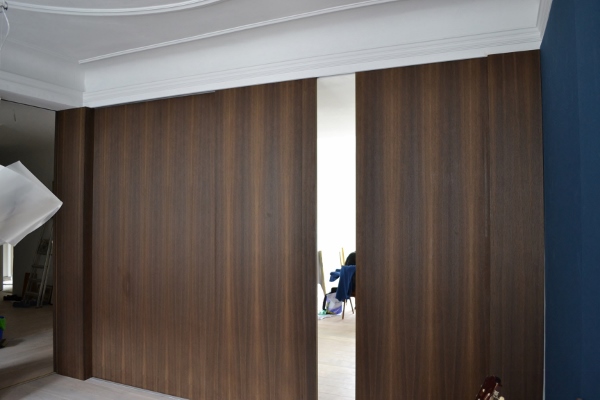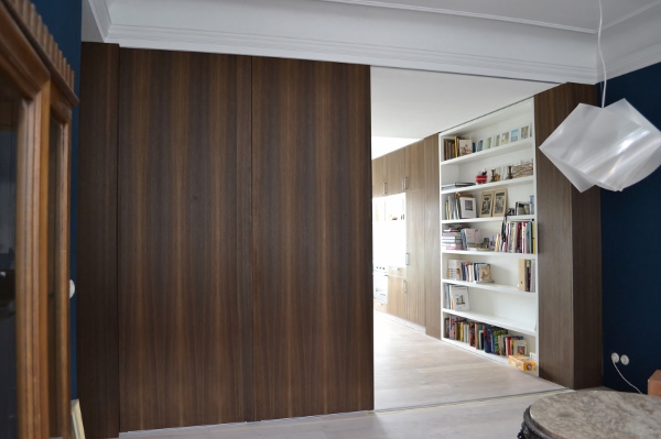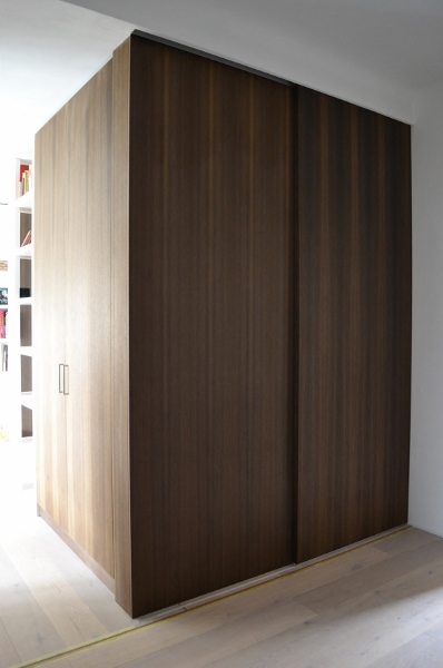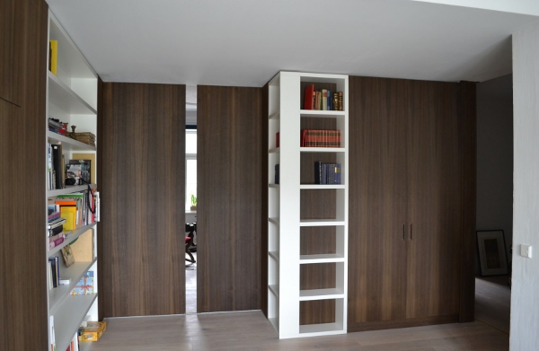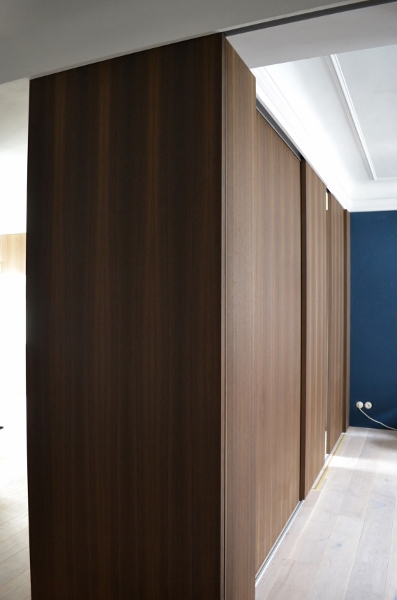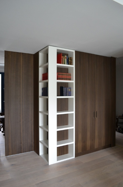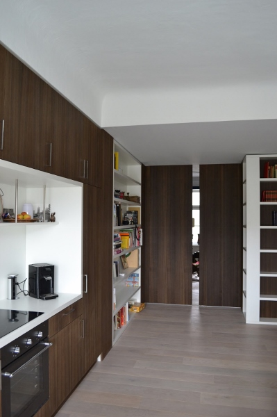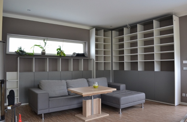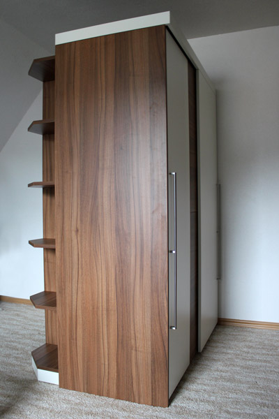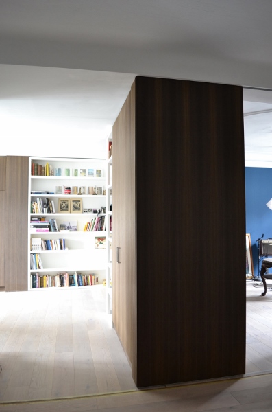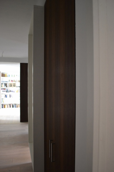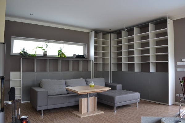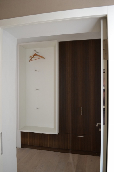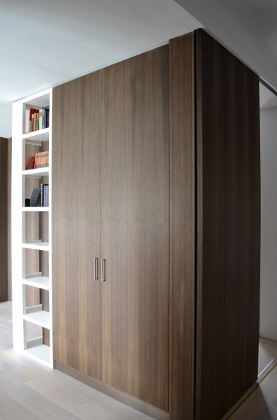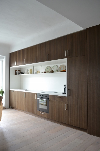 alle Fronten in Holzfurnier Räuchereiche, sowie weißen Elementen - Möbelstücke mit integrierten Schiebeelementen als Raumteiler - teilweise Raumhoch - Küche und Gaderobe mit ausgestelltem Rahmen - Gestaltung durch Dipl. Ing. Thomas Laubert