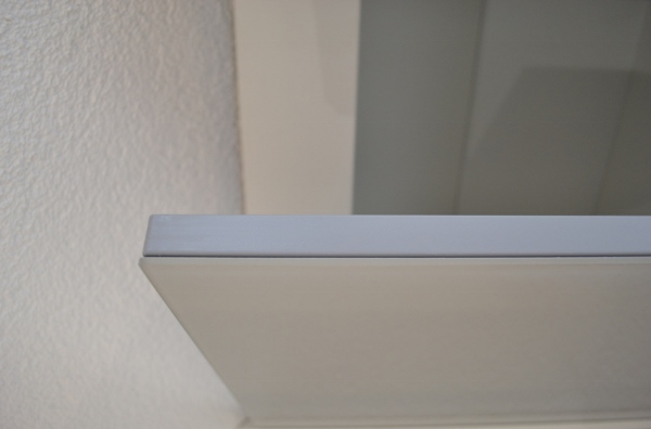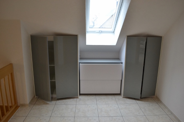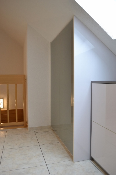 an Dachschräge angepasste Schrankelemente - Seitenflächen und Schubkästenfronten in weiß hochglanz - große Türfronten mit lackiertem Glas in hellgrau